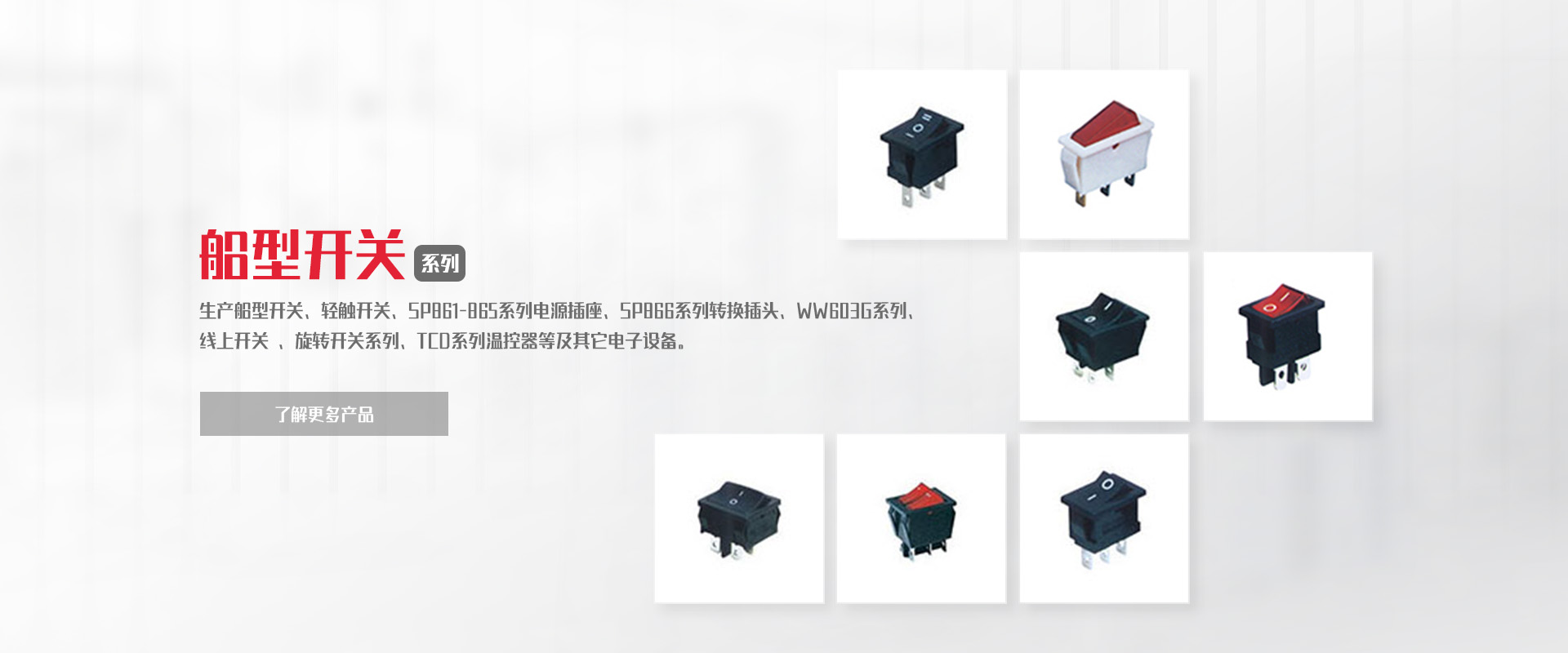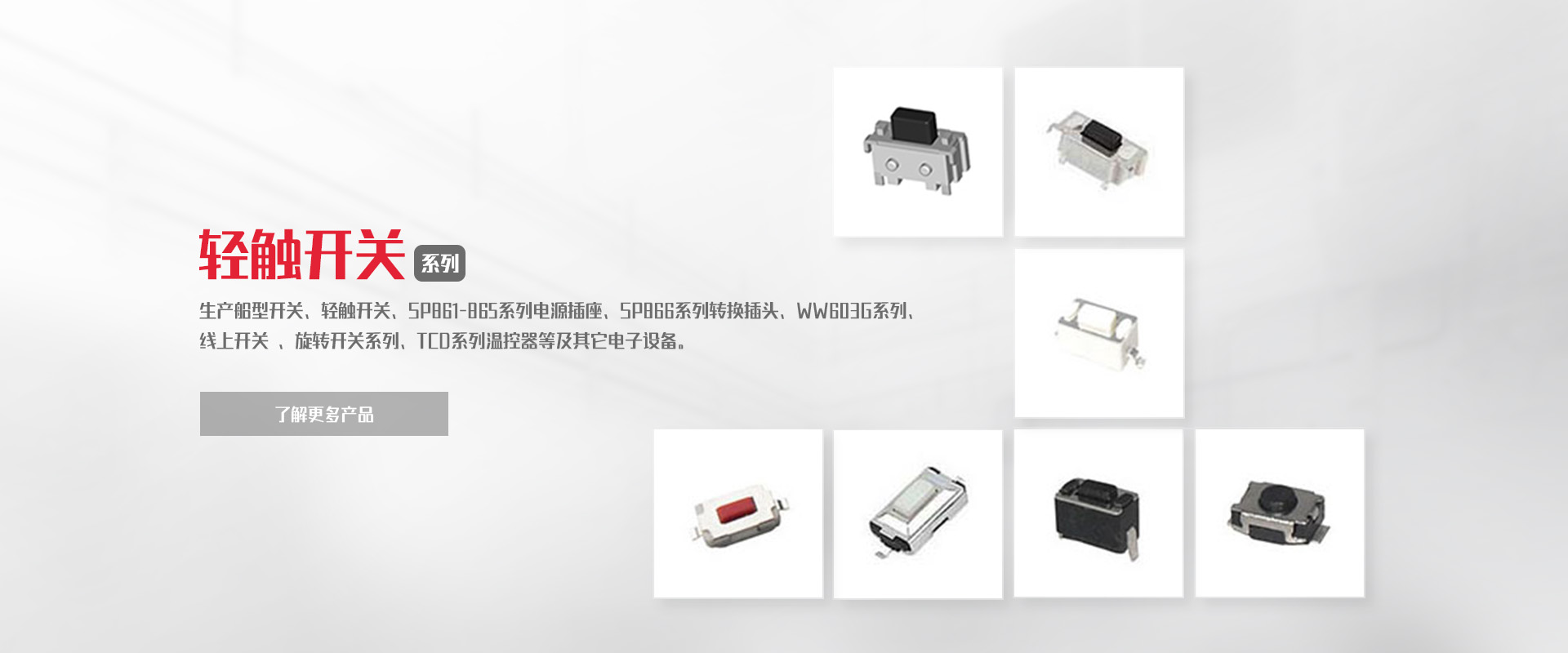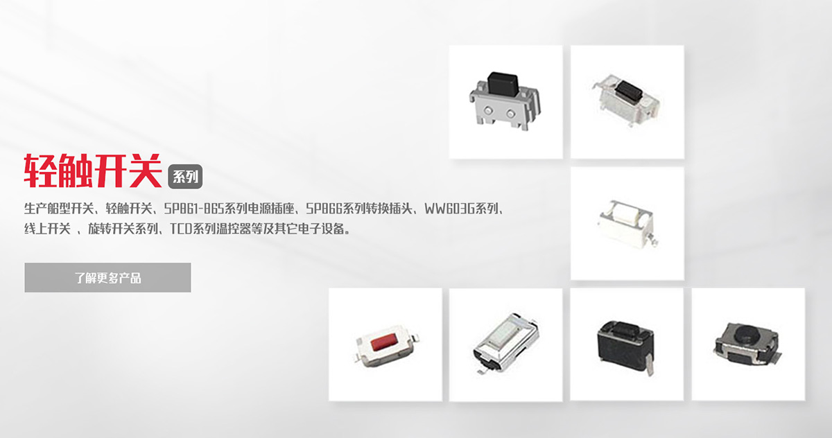致力于船型開關(guān)、負載開關(guān)、輕觸開關(guān)、微動開關(guān)等產(chǎn)品的研發(fā)、制造、銷售。